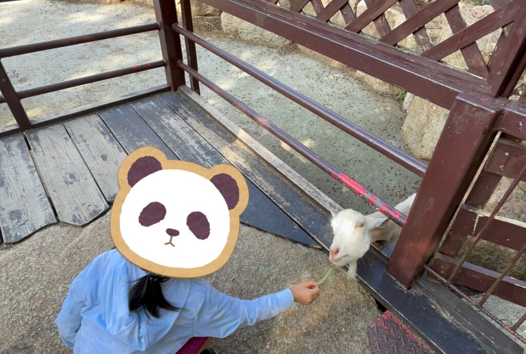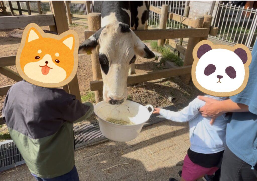 今回は、牛とヤギの餌やり体験をしてきました!餌やり時間は決まっていてホームページで確認しておくと安心です。牧場内の掲示板にもタイムスケジュールが掲示されていて確認可能です。 牛(ランボルギーニ)がとても大きくてかなりビビりながらも2人で餌やりをしていました。